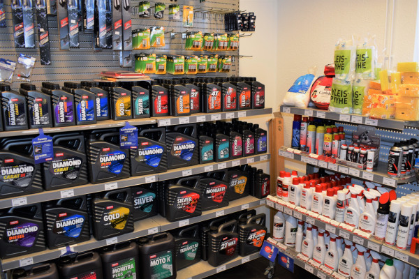 Kattava valikoima autotarvikkeita ja -kemikaaleja.