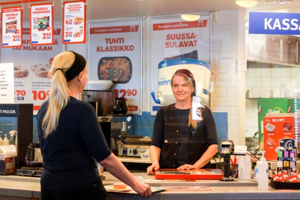 Lahjatavaroita, pullo- ja tölkkipalautus kassalle.